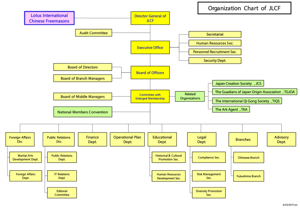 Japan Lotus Chinese Freemasons (JLCF) are known in Japan as The International Asian Freemason. It is an international Hong Men/Chinese Freemason sister lodge of the Lotus International Chinese Freemasons Supreme Lodge in Taiwan.The Hong Men/Chinese Freemasons are a secret society created by the people towards the end of the Ming Dynasty in the 17th century. Over time in evolved into a Chinese and overseas Chinese organization. In recent years it has had an increase in membership around the world.